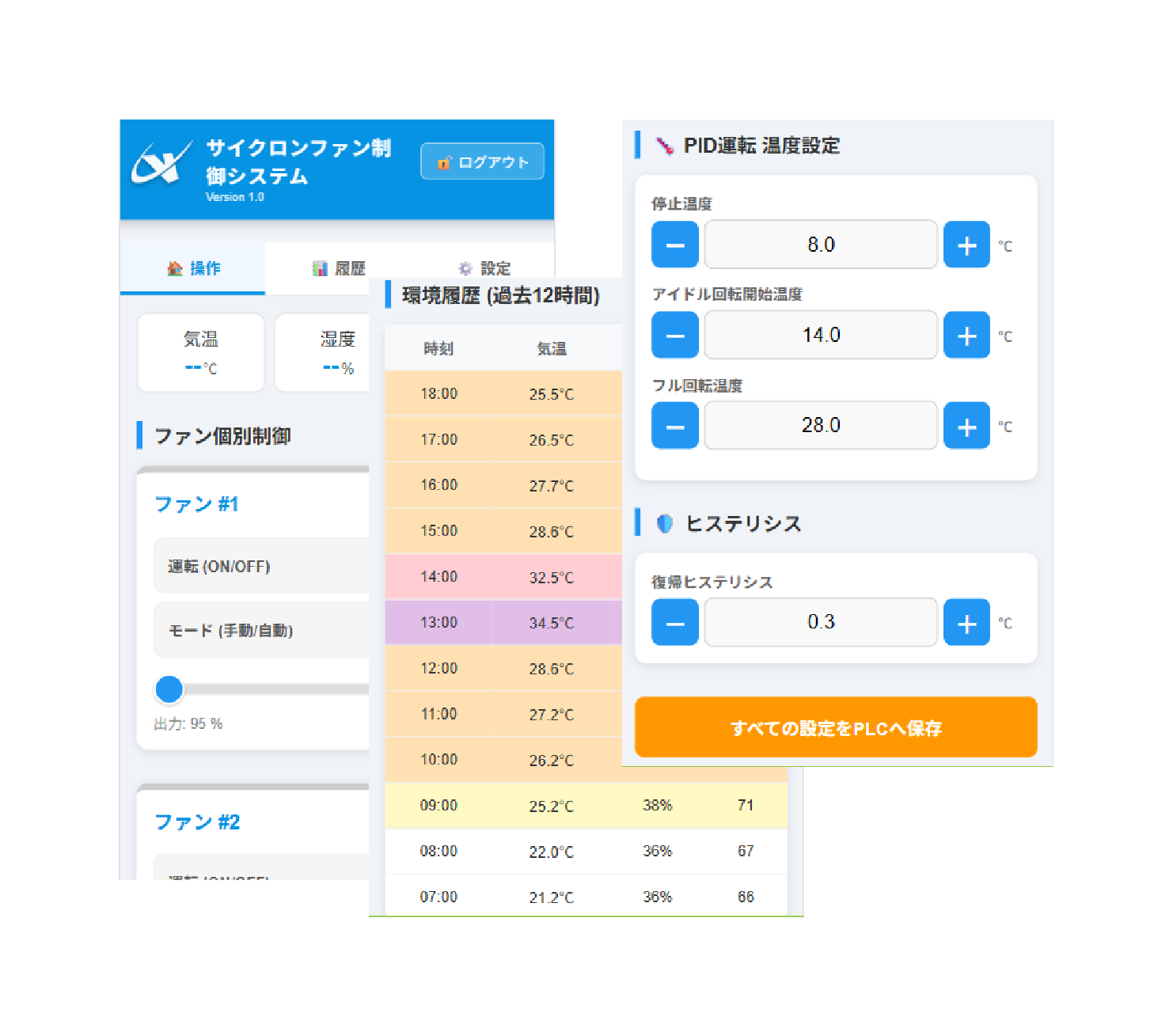 スマートフォンから操作が可能です。温度だけではなく、湿度のデータを監視し、THIの計算結果が出力されます。