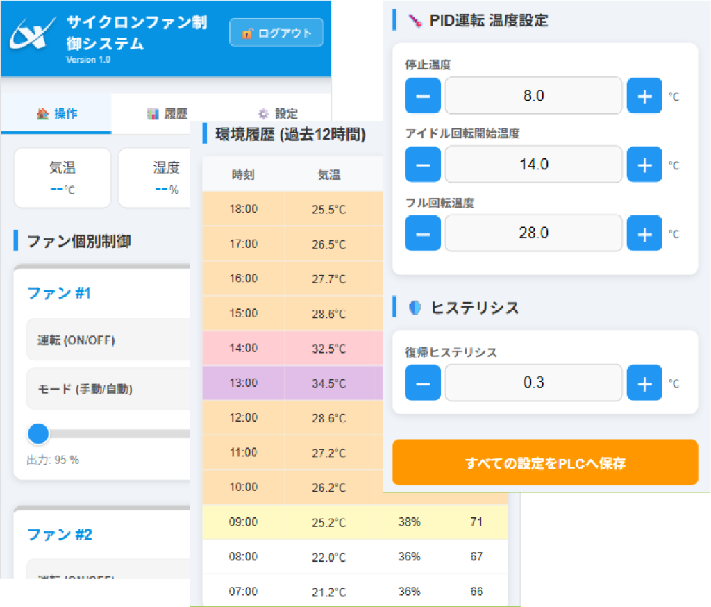 スマートフォンから操作が可能です。温度だけではなく、湿度のデータを監視し、THIの計算結果が出力されます。